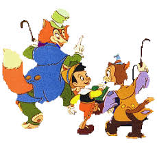 No caminho porém encontrou dois estranhos que logo foram conversando com ele. Era uma Raposa e um Gato, que ficaram maravilhados ao ver um boneco de madeira falante e pensaram em ganhar dinheiro às custas do mesmo.